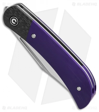 - Purple G-10 handle and carbon fiber bolsters.