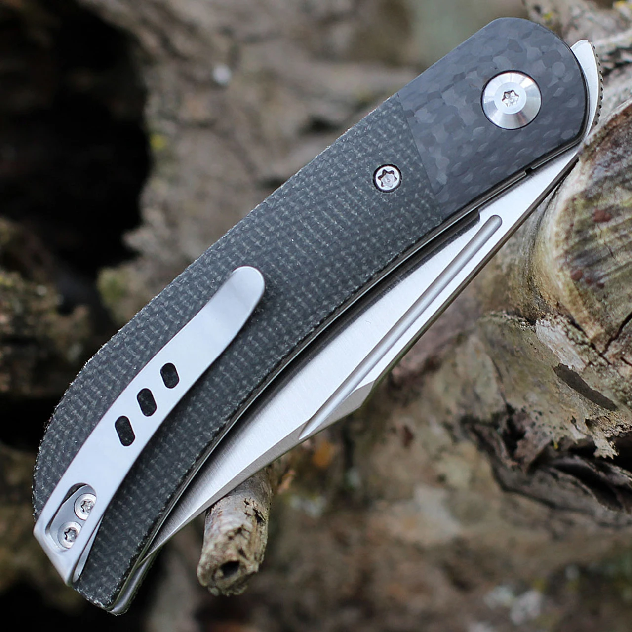 CIVIVI Appalachian Drifter II Front Flipper (C19010C-3) – 2.96″ Satin Nitro-V Clip Point Blade, Dark Green Micarta with Twill Carbon Fiber Bolster