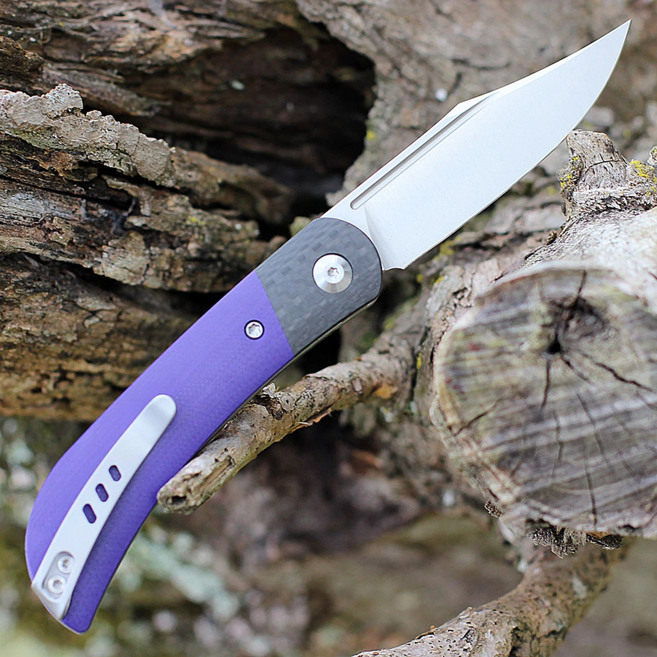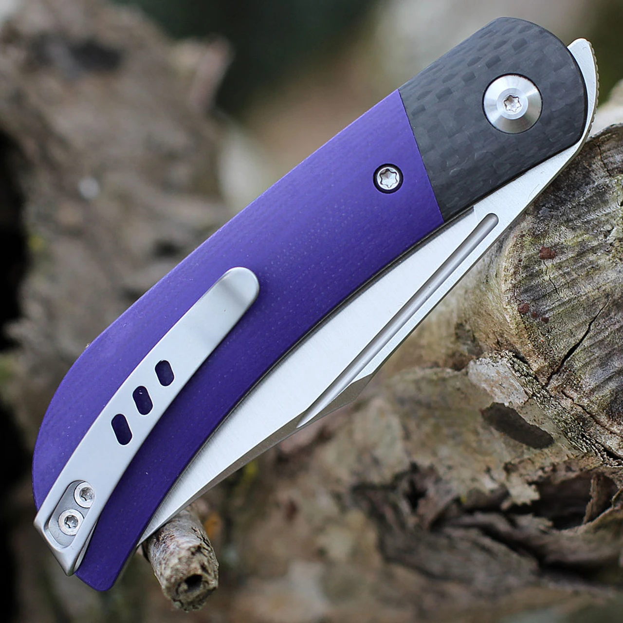 - Purple G-10 handle and carbon fiber bolsters.