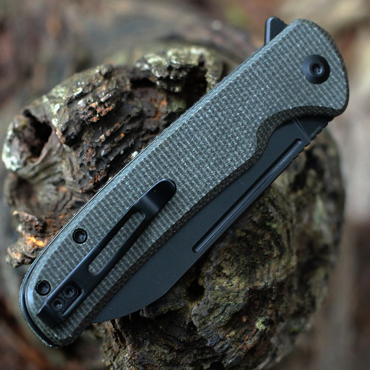- Green micarta handle scales on black steel liners.