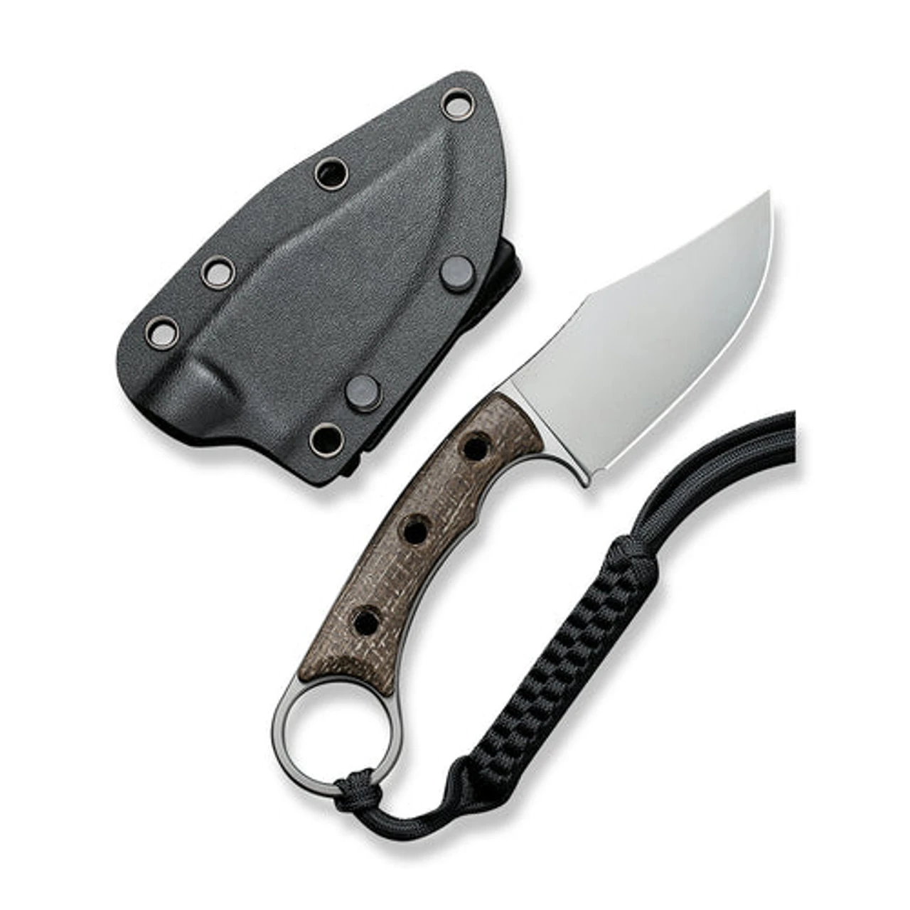 - Black Kydex sheath and a black tied paracord lanyard.