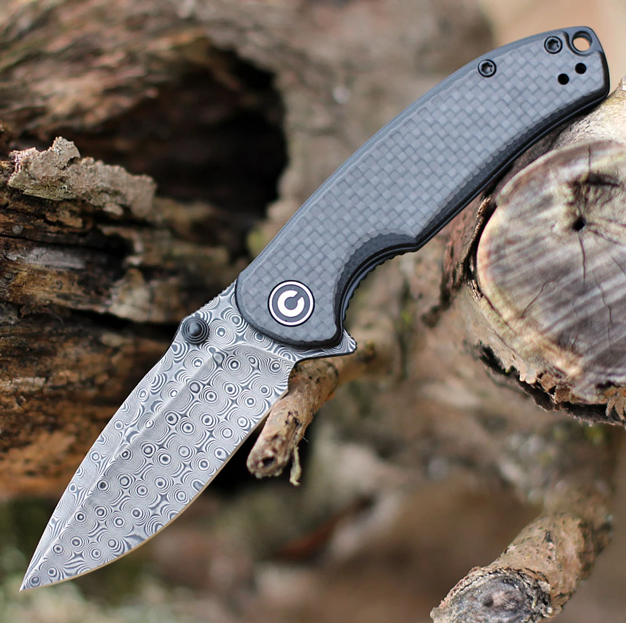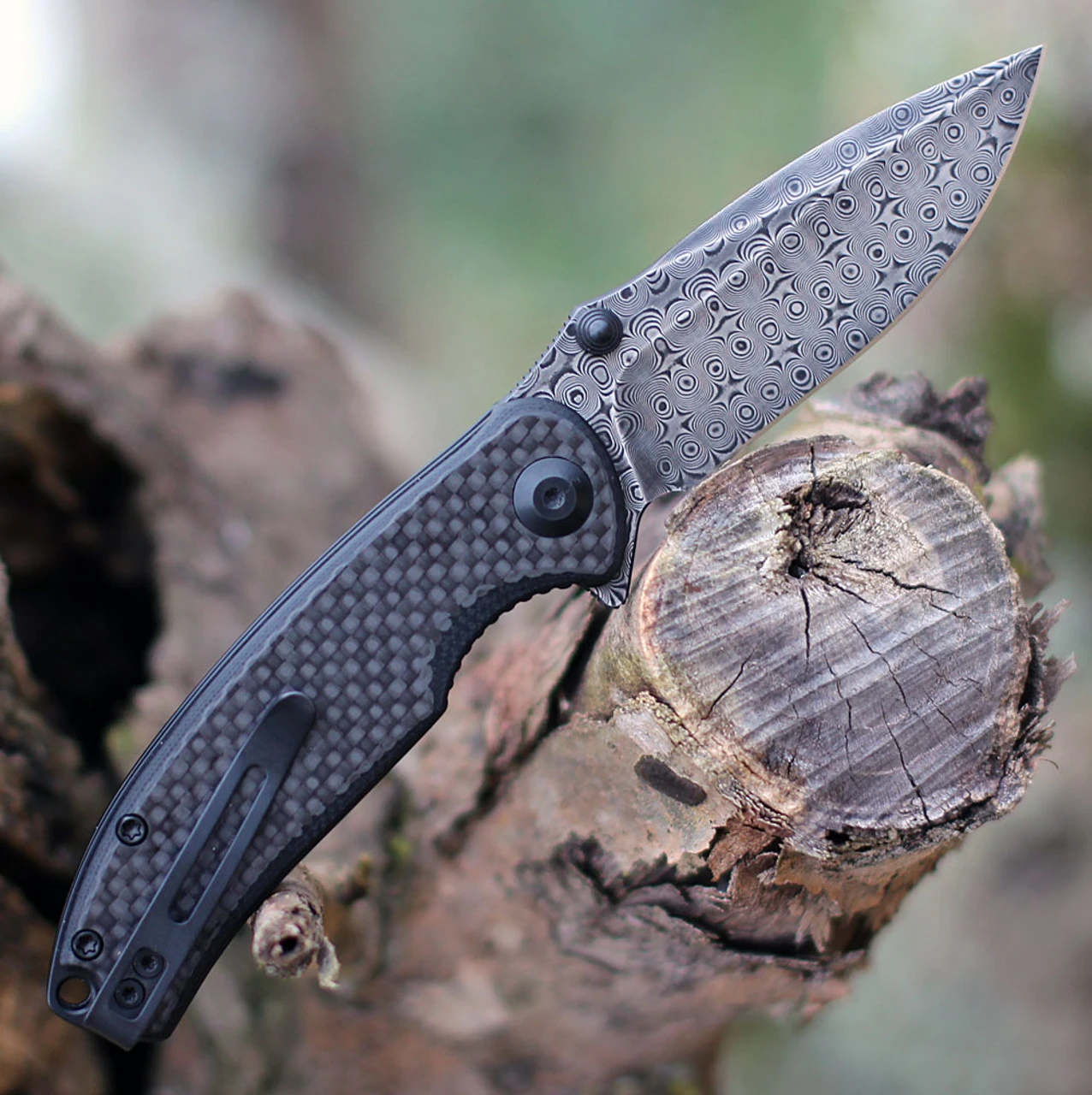 The CIVIVI Pintail is a versatile knife with many different variations. It’s made with premium materials and the craftsmanship is excellent. The blade is made of Damascus steel in a drop point style. The handle is made of carbon fiber and G-10, with a stainless steel liner. The liner lock is easily accessible and ambidextrous thumb studs make it possible to open the knife one-handed, whether you’re left-handed or right-handed.