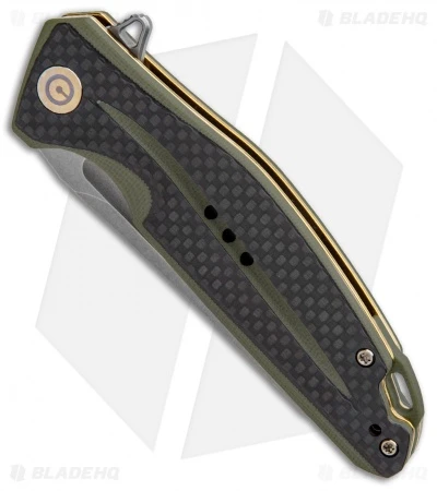 This model of the CIVIVI Statera comes with an OD green G-10 and carbon fiber handle with gold stainless steel liners.