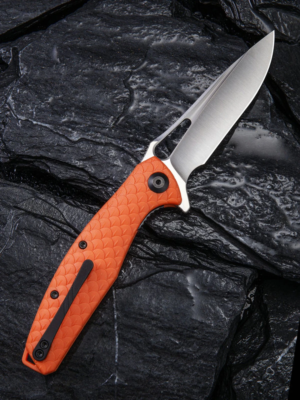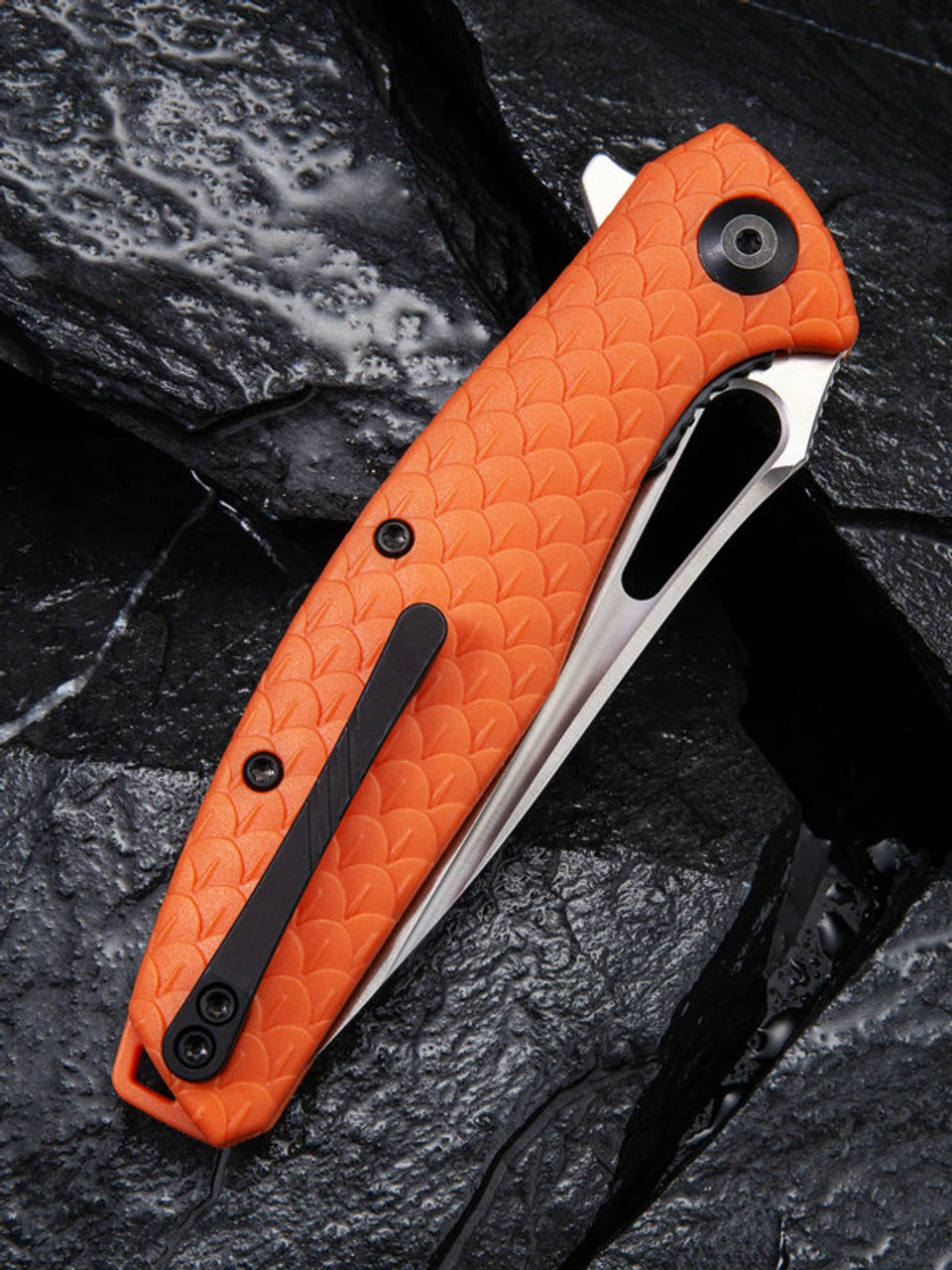 - Orange FRN handle scales molded to look like scale.